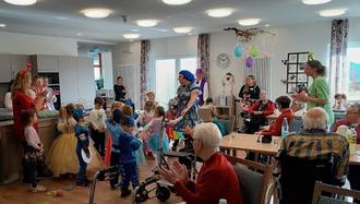 Mit viel Tamtam, bunten Kostümen und einer großen Portion guter Laune zog die Kita Mengerskirchen mit 20 Kindern am Altweiber-Donnerstag ins örtliche Seniorenzentrum Katharina Kasper Haus ein. Die kleinen Jecken hatten es sich zur Aufgabe gemacht, den Bewohnerinnen und Bewohnern, sowie den Mitarbeitenden einen unvergesslichen Vormittag zu bereiten - und das ist ihnen mehr als gelungen! Schon beim Betreten des Hauses verbreiteten die fröhlichen Kinder mit bunten Luftschlangen, lustigen Liedern und einer riesigen Portion Karnevalsstimmung pure Freude. Die Bewohnerinnen und Bewohner des Seniorenheims freuten sich sichtlich über den Besuch und klatschten begeistert mit, als die Kinder ihre einstudierten Lieder zum Besten gaben. Ein besonderes Highlight für die kleinen Karnevalisten war die traditionelle Altweiber-Aktion: das Abschneiden der Krawatten der anwesenden Herren. Mit großer Begeisterung machten sich die Kinder ans Werk und sorgten für viele Lacher und strahlende Gesichter. Nach so viel närrischer Freude durften sich die kleinen Besucher über eine schmackhafte Belohnung freuen, bevor sie sich wieder auf den Rückweg in die Kita machten. Einig waren sich alle: Diese fröhliche Tradition bringt jedes Jahr aufs Neue viel Freude - und wir freuen uns schon auf den nächsten Altweiber-Besuch!