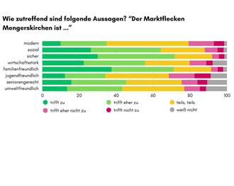Insgesamt zeigt sich ein recht heterogenes Bild der Bewertungen. Am besten werden die Bereiche „Familienfreundlichkeit“ und „Sicherheit“ bewertet, wohingegen Mengerskirchen weniger als „modern“ oder „jugendfreundlich“ gesehen wird. Auch die Aspekte „Seniorengerechtigkeit“ und „Umweltschutz“ werden insgesamt nicht überragend gut bewertet.