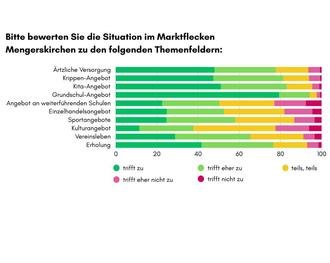 Insgesamt zeigt sich eine positive Bewertung fast aller genannter Lebensbereiche. Besonders positiv fällt die Bewertung des Grundschulangebotes ins Auge. Auch die ärztliche Versorgung, das Krippen- und Kita-Angebot und der Bereich Ruhe und Erholung werden deutlich positiv bewertet. Etwas durchmischter ist die Meinung der Befragten in den Bereichen Vereinsleben, Angebot an weiterführenden Schulen, Einzelhandelsangebot und Sportangebote. Am wenigsten positiv wird der Bereich Freizeit und Kulturangebot bewertet.