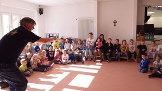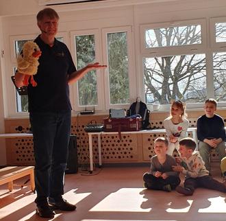 Einen musikalischen und bewegten Vormittag erlebten die Kinder und Erzieherinnen der Kita Winkels mal wieder mit dem Liederbacher Liedermacher Michael Kirsten. Dieser war mit seiner Handpuppe, der Ente KIMI, nach Winkels gekommen und präsentierte dort sein erneut Frühlingsprogramm.