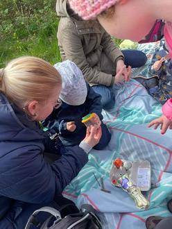 Der zweite Eltern-Kind-Kurs unter der Leitung von Alexandra Reusch fand am Waldsee in Probbach statt. Neun Kinder im Alter zwischen zwei und sechs Jahren machten sich mit ihren Eltern auf den Weg in den Wald, trafen Willi Waldwichtel, lernten von ihm einiges über Hasen und machten sich dann an die Arbeit, mit Hilfe der Ostersuchkisten verschiedene Rätsel zu lösen und Osterhasen aus Astgabeln zu basteln.