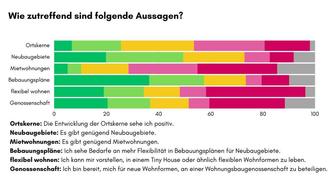 Die Entwicklung der Ortskerne wird von vielen Befragten kritisch gesehen, was sich teils auch in den Freitextantworten zeigt. Zwar sind viele der Antwortenden der Auffassung, dass es genügend Neubaugebiete gibt, jedoch sind sehr viele Befragte der Meinung, dass die Zahl der vorhandenen Mietwohnungen nicht ausreicht. Die Bebauungspläne für Neubaugebiete sollten nach Auffassung der Befragten flexibler werden. Während die Hälfte der Antwortenden sich nicht oder eher nicht vorstellen kann, in einer flexiblen Wohnform wie einem Tiny House zu wohnen, kommt dies für gut ein Drittel der Befragten durchaus in Frage. Auch in der Frage nach einer möglichen Beteiligung an einer Wohnungsbaugenossenschaft sind die Befragten gespalten.