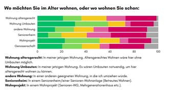 Es zeigt sich, dass Seniorenheime (inkl. Wohnformen wie betreutes Wohnen) am wenigsten beliebt sind. Auch ein Umzug in eine andere Wohnung ist für viele Befragte keine favorisierte Option. Die eigene Wohnung - auch dann, wenn Umbauten nötig wären - wird relativ häufig als Wunsch genannt, aber auch Wohnprojekte kommen für viele Antwortenden in Frage.