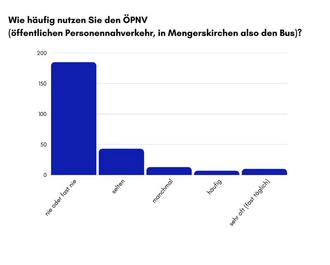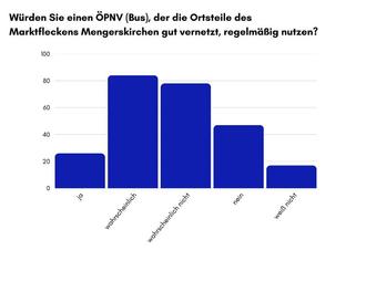 Während der öffentliche Personennahverkehr (ÖPNV) in Mengerskirchen, also konkret der Bus, von den meisten der Befragten kaum oder gar nicht genutzt wird, sehen einige der Befragten hier ein Potenzial bei einer guten Verbindung der verschiedenen Ortsteile, wobei die Mehrheit der Antwortenden angibt, auch ein solches verbessertes Angebot nicht oder wahrscheinlich nicht zu nutzen.