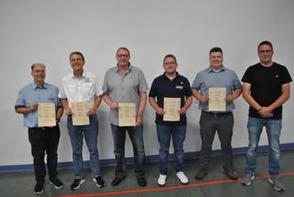 Vorsitzender Kevin Steger (rechts) ehrte langjährige Mitglieder der Feuerwehr Winkels.