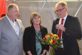 Für Landrat Köberle war die Professionalisierung des Amtes der richtige Schritt, denn die Tätigkeit eines Kreisbrandinspektors sei so umfangreich, dass man es nicht nebenbei machen könne. Michael Köberle erinnerte daran, welch hohen Arbeitsaufwand Georg Hauch während der Corona-Pandemie beim Aufbau des Impfzentrums, der Verteilung von Schutzausrüstung und der Impfung der Feuerwehraktiven und bei Hochwassereinsätzen. „Dazu hast du in den vergangenen 20 Jahren die Entwicklung des Brand- und Katastrophenschutzes maßgeblich vorangetrieben“. Als Beispiele nannte der Landrat die Erstellung des ersten Bedarfs- und Entwicklungsplanes für unseren Landkreis, die Weiterentwicklung der rettungsdienstlichen Strukturen sowie die Zusammenfassung der Ausbildung unserer Wehren im Landkreis. Michael Köberle dankte auch Gabi Hauch für die Unterstützung ihres Mannes mit einem Blumenstrauß.