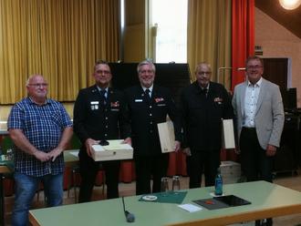 In Anerkennung ihrer langjährigen Verdienste um das Feuerwehrwesen hat die Gemeindevertretung am 19.07.2022 beschlossen, den Herren Klaus-Dieter Schlicht, Michael Kintscher und Matthäus Hertl die Ehrenbezeichnung „Ehrengemeindebrandinspektor" sowie den Herren Joachim Prinz und Matthias Schäfer die Ehrenbezeichnung „Ehrenwehrführer" zu verleihen. Der Beschluss wurde anschließend direkt umgesetzt und den Anwesenden die Urkunden mitsamt einem Präsent der Gemeinde von dem stellvertretenden Vorsitzenden der Gemeindevertretung Andreas Bendel und Bürgermeister Thomas Scholz persönlich ausgehändigt. Klaus-Dieter Schlicht erhielt zudem die Verdienstmedaille des Marktfleckens Mengerskirchen.