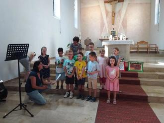 Los ging es mit einem mitunter emotionalen Wortgottesdienst unter dem Motto „Mögen Engel euch begleiten“. Gemeindereferentin Britta Höhler führte durch den Gottesdienst, der durch Liedeinlagen, Gebete und Wünsche von den Kindern mitgestaltet wurde. Auch die Erzieherinnen brachten ihre Wünsche für die Kinder zum Ausdruck und im Gebet der Eltern, vorgetragen durch eine Mutter, wurde deutlich, dass jetzt ein weiterer neuer Lebensabschnitt für Kinder UND Eltern bevorsteht. Dass die Kinder jetzt bereit dafür sind brachten sie lautstark in dem Lied „In Gottes Hand geborgen“ zu Geltung, in dem es im Refrain heißt: „… Es ist soweit, wir sind groß, haben Flügel, lasst uns los“. Einige Eltern bekamen durchaus feuchte Augen dabei.