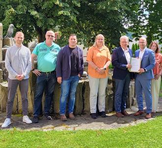 Übergabe der Bescheide aus dem Dorfentwicklungsprogramm in Mengerskirchen (von links): Moritz Ruoff vom Amt für den Ländlichen Raum, Umwelt, Veterinärwesen und Verbraucherschutz, Büroleiter Manfred Horz, Dimitris Michalakelis, Brigitte Kintscher, Erster Kreisbeigeordneter Jörg Sauer, der Mengerskirchener Bürgermeister Daniel Melchert und Anett-Christin Hochheim (Leiterin Amt für den Ländlichen Raum, Umwelt, Veterinärwesen und Verbraucherschutz).