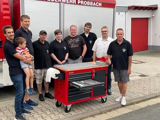 Voller Stolz präsentiert die Freiwillige Feuerwehr Probbach die neu angeschaffte, fahrbare Werkbank der Öffentlichkeit.