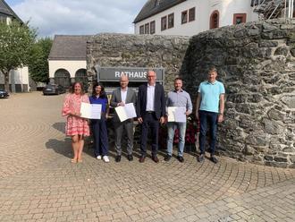 Übergabe der Förderbescheide aus dem Zukunftsfonds am Rathaus in Mengerskirchen (von links): Anna Göttnauer, Katja Konheiser, der Mengerskirchener Bürgermeister Daniel Melchert, Landrat Michael Köberle, Marco Schlicht und Dominik Müller.
