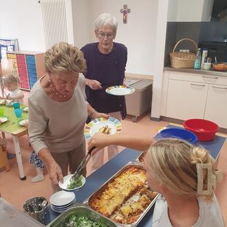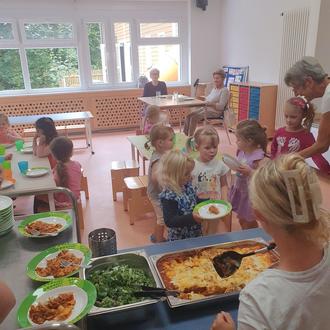 Mit Marlies Reifert und Elfriede Losacker wagten sich zwei mutige Seniorinnen in die Kita und nahmen am Mittagessen teil. Nach einem gemeinsamen gesungenen Tischgebet konnten sich erst die Kinder etwas zu Essen holen, anschließend versorgten sich auch die Seniorinnen mit Lasagne und Salat.