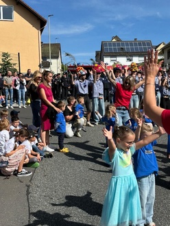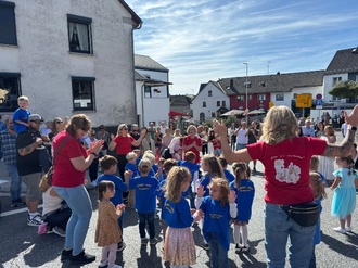 Die Kita führte ihren „Klatsch- Patsch- Tanz“ auf. Nicht nur die Kinder hatten ihren Spaß, sondern auch die Kirmesjugend und alle anderen Zuschauer feuerten die Kleinen mit Begeisterung an.Im Anschluss tanzte die Kirmesjugend mit dem gesamten Kindergarten den „Regenwürmer-Tanz“.