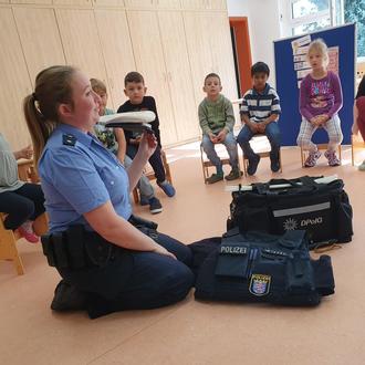 Frau Ebeling war der Einladung der Kita gefolgt und nahm sich einen Vormittag für die Kinder Zeit. Im Kreis ging es los und sie erklärte den Kindern, was ein Polizist normalerweise alles an bzw. bei sich hat. Angefangen von der Kleidung, den Dienstgraden und dem Hessenwappen bis hin zum Gürtel, an dem die Handschellen, die Taschenlampe, das Pfefferspray und auch die im Holster gut gesicherte Pistole befestigt waren. Im Patronenmagazin konnten die Kinder sehen, dass die Kugeln eigentlich keine Kugeln sind und so erfuhren sie wie Patronen funktionieren. Dass die mitgebrachten Kabelbinder gar nicht für Kabel sondern zum Fesseln von Dieben gedacht sind, wurde mit dem Hinweis „Das dürfen auch nur Polizisten so machen!!“ mit Nachdruck erklärt.