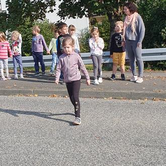 Nachdem die Kinder lange zugehört hatten, ging es gemeinsam an die Straße, wo das sichere Überqueren einer Straße geübt wurde. „Stehen“ - „Sehen“ - „Gehen“ ist der Spruch, der von nun an bei jedem Ausflug und jeder Straßenüberquerung zu hören sein wird. Zum Thema Verkehrssicherheit betonte Frau Ebeling noch, wie wichtig das richtige Angeschnallt sein im Auto ist und, dass die Kinder ruhig ihre Eltern immer wieder daran erinnern sollen.