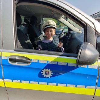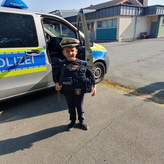 Anschließend durfte jedes Kind noch ein Foto als Polizist von sich machen lassen und dafür die Schutzweste und eine Polizeimütze anziehen und mit einem echten Schlagstock vor dem Polizeiauto und auch im Auto posieren.