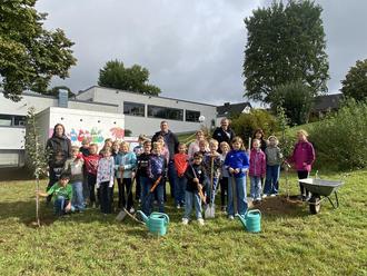 Die Klasse 4a übernimmt zunächst symbolisch die Patenschaft für die beiden Bäume und kümmert sich in den nächsten Wochen darum, dass diese ausreichend Wasser erhalten.
