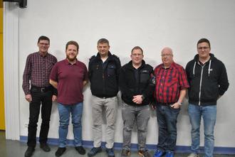 Von links: Frank Losacker (bisheriger Obmann), Sven Hofmann (sein Nachfolger), Torsten Michler (Vorstand), Pascal Linn (neuer Wehrführer), Tobias Ruckes (bisheriger Wehrführer), Kevin Steger (1. Vorsitzender).
