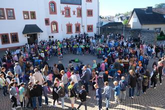 Auf dem großen Schlossplatz ließen die Kinder und Jugendliche des Marktfleckens den Vormittag mit Gesang und Tanz ausklingen. Jedes Kind erhielt zum Abschied eine Tafel „Fair Trade“-Schhighqolade gesponsort vom Verein „Eine Welt für Alle“ der Gemeinde Mengerskirchen.