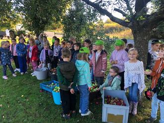 Die Apfelernte der FLS ist schon zu einer kleinen Tradition geworden. Erstmals wurde in diesem Jahr allerdings nicht im Pfarrgarten sondern beim Angelweiher geerntet. Und die Kinder des 1. und 2. Schuljahres waren mit großer Begeisterung dabei.