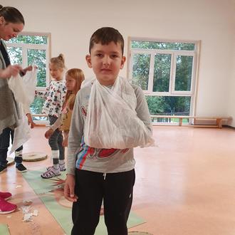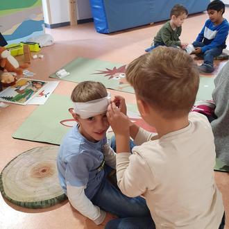 Nichts war „passiert“! im Gegenteil. Die Vorschulkinder der Kath. Kita „Unterm Regenbogen“ durften an einem Vormittag viel darüber lernen, wie man Erste Hilfe leisten kann, wenn etwas passiert und jemand verletzt ist.
