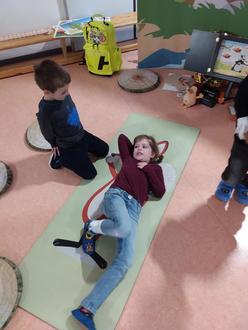 Alles wurde eifrig in Partnerarbeit geübt, auch die stabile Seitenlage. Anhand der 4 „K“s konnten sich die Kinder die Schritte gut merken: K= Kaktus (beide Arme nach oben legen), K=Kuscheln (Eine Handoberfläche ans Kinn legen), K=Knie (das Knie von der gleichen Seite der Hand aufstellen) und anschließend die Person drehen und K=Kopf (den Kopf überstrecken). Damit auch bei allen Übungen genügend Zeit blieb, wurden die Vorschulkinder für diesen Vormittag in zwei Gruppen aufgeteilt.