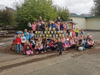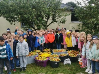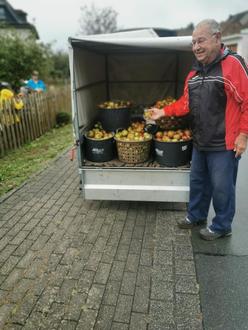Geerntet wurde im Pfarrgarten und die Kinder des 1. und 2. Schuljahres waren mit großer Begeisterung dabei. Die Bauarbeiter, die zur Zeit das Pfarrhaus umbauen, halfen gerne mit und schüttelten kräftig die Äpfel von den Bäumen. Am Ende war der Anhänger von Karl Loch gut ausgelastet auf der Fahrt zur Saftpresse in Beilstein.