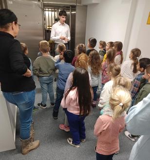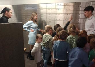 Spannend war auf jeden Fall der Gang in den Tresor. Die dicke Stahltür, die nur mit einem Code geöffnet werden kann, beeindruckte die Kinder schon sehr. Auch, dass zusätzlich noch eine Gittertür den Raum sichert. „Das sieht ja aus wie im Gefängnis!“, bemerkte ein Junge. Anschließend durften die Kinder das in Rollen verpackte Münzgeld halten, zusehen, wie schnell die Geldzählmaschine 100 5-Euro-Scheine zählen kann und erfuhren, woran man erkennen kann, dass ein Schein „echt“ ist.