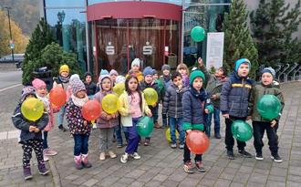 Bevor der Besuch zu Ende ging wurden die Kinder noch reich mit Knax-Heften, Gummibären und Luftballons beschenkt und beim Weg zurück waren wir durch die Luftballons noch auffälliger, als eine Kindergruppe mit 22 Kindern es sowieso schon ist;-)