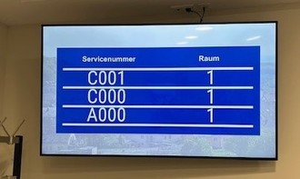 Im Flureingang zum Rathaus verweist ein digitaler Hinweis auf den Eintritt ins Foyer. Dort wird man aufgefordert ein sogenanntes „Ticket“ zu ziehen. Durch Anzeige auf einem großen Bildschirm regelt dann ein sogenanntes Leitsystem, in welcher Reihenfolge die Bürger nacheinander eintreten können.