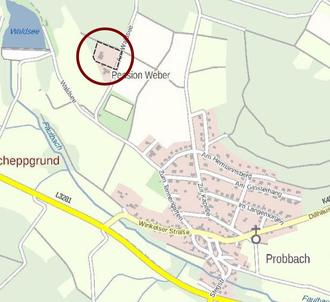 Der Geltungsbereich des Bebauungsplans ist aus den unten abgebildeten, unmaßstäblichen Karten ersichtlich. Er liegt nordwestlich der Ortslage von Probbach. Er umfasst in der Gemarkung Probbach, Flur 5 das Flurstück 64/1 und das Flurstück 60 (Straße “Am Waldsee“) teilweise.