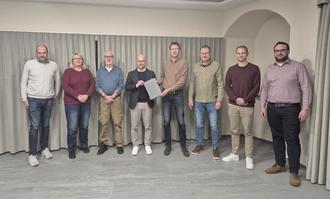 Überreichung des Zuwendungsbescheid aus dem Dorfentwicklungsprogramm (von links): Kai Gerhardt, Brigitte Kintscher, Achim Peters (alle in der Steuerungsgruppe), Bürgermeister Daniel Melchert, Dominik Müller und Johannes Diehl (ebenfalls Steuerungsgruppe) sowie Moritz Ruoff und Florian Stupinsky vom Amt für ländlichen Raum.