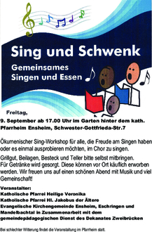 Am Freitag, 9. September, ab 17.00 Uhr im Garten hinter dem kath. Pfarrheim Ensheim, Schwester-Gottfrieda-Str.7.