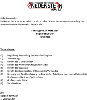 im Namen des Vorstandes lade ich euch recht herzlich zur Jahreshauptversammlung des Feuerwehrvereins Neuenstein - Aua e.V. ein.
