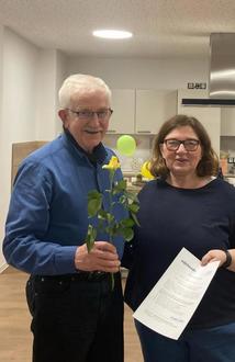 Am Foto ist, stellvertretend für alle Teilnehmenden, Heinrich Nitz zu sehen, wie er von der Kursleitung Kerstin Göppel am letzten Abend mit einer Rose und dem Teilnahmezertifikat verabschiedet wurde.