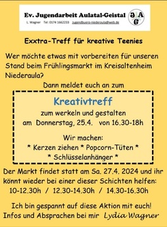 Am letzten Freitag waren wir noch unterwegs nach Kassel zu Ikea um kleinere Möbel für den Jugendraum zu kaufen und gleich auch aufzubauen. Naklar mussten auch farbenfrohe Kissen und eine Dekopflanze mit! Nach den Ferien geht es im Teenie Club weiter! Im April gibt es einen Kreativtreff zur Vorbereitung auf unseren Stand beim Frühlingsmarkt im Kreisaltenheim. Wer möchte, kann auch wieder am Stand in einer Schicht mithelfen. Im Mai starten wir nach Frau Wagners Urlaub am Donnerstag, 16.5. Dafür kommt rechtzeitig der Terminplan aufs Handy.