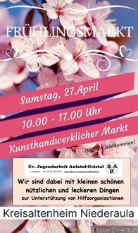 Wir werden dabei sein am Samstag, 17.4. ab 10h im Kreisaltenheim Niederaula und freuen uns auf viele Besucher, die unsere kleinen schönen Dinge mitnehmen, damit wir von den Einnahmen Hilfsorganisationen unterstützen können!