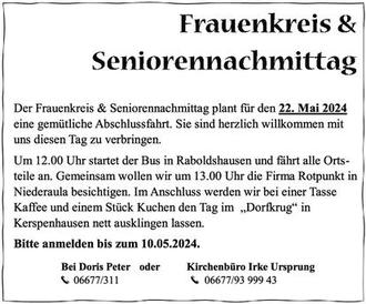 Der Frauenkreis & Seniorennachmittag plant für den 22. Mai 2024 eine gemütliche Abschlussfahrt. Sie sind herzlich willkommen mit uns diesen Tag zu verbringen.
