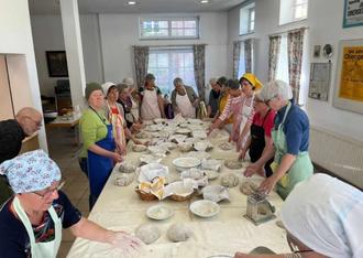 Zum ersten Brotbackseminar des Heimat- und Trachtenverein Obergeis in 2024 waren die Landfrauen aus Schenklengsfeld angereist. Mit ihrer Vorsitzenden Renate Giesel waren 13 Frauen und zwei Männer nach Obergeis gekommen um hier das traditionelle handwerkliche, bäuerliche Brotbacken zu lernen. Die beiden gestandenen Männer waren mitgenommen worden damit sie sich über das Anheizen und der Temperaturführung des Backofens informieren können.