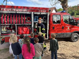 Der Projekttag begann am Morgen mit einer professionell begleiteten Evakuierungsübung. Die Kinder meisterten diese sehr gut- ein wichtiger Schritt, um im Ernstfall gut vorbereitet zu sein. Im Anschluss konnten die Kinder an sechs abwechslungsreichen Stationen, spielerisch viel über die Feuerwehrarbeit und den Brandschutz lernen. Besonders bestaunt wurde das große Feuerwehrfahrzeug, das die Kinder von innen und außen erkunden durften. Bei einem Bastelangebot wurden kreative Flammen und Feuerwehrbilder gestaltet, während ein Hindernisparcours die motorischen Fähigkeiten der Kinder förderte.
