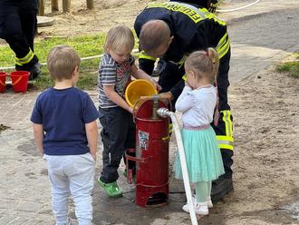 Ein weiteres Highlight war das sichere Anzünden einer Kerze mit einem Streichholz- unter fachkundiger Anleitung. Am meisten Freude bereitete das Wasserspritzen mit der Kübelspritze, mit dem kleinen Feuerwehrschlauch durften die Kinder selbst Hand anlegen und mit dem Wasserstrahl kleine Bausteine treffen.