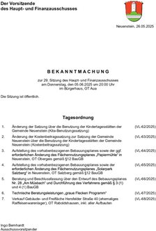 | 5. | Beratung und Beschlussfassung über den Entwurf des Bebauungsplanes Nr. 28 „Am Müsbach“ und Durchführung des Verfahrens gemäß § 3 (1) und 4 (1) BauGB | (VL-66/2025) |