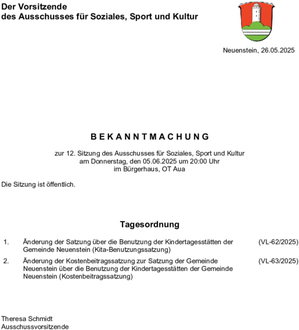 | 2. | Änderung der Kostenbeitragssatzung zur Satzung der Gemeinde Neuenstein über die Benutzung der Kindertagesstätten der Gemeinde Neuenstein (Kostenbeitragssatzung) | (VL-63/2025) |