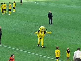 Das Foto zeigt Maskottchen Emma beim letzten Heimspiel des BVB gegen Darmstadt 98 vor der Südtribüne, wo Marco Reus von den Fans verabschiedet wurde und stammt von Pfarrer und BVB-Fan Michael Zehender.