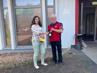 Silke Reif erhält für die 25. Spende ein Präsent vom stellvertretenden Bereitschaftsleiter Ernst Hellwig.