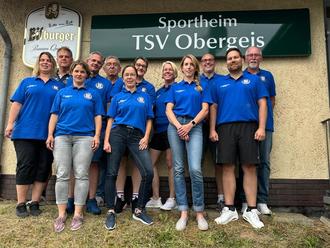Das Team der Fußballschule vor seiner Sitzung am Sportlerheim in Obergeis in Vorfreude auf Weltmeister Frank Mill und Giovanni Federico von Borussia Dortmund