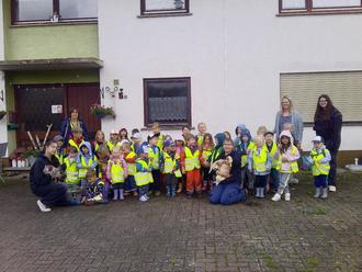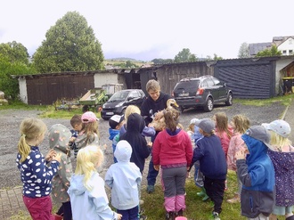 Die Kita Sonnenschein hat am Dienstag, den 08.07.2025 einen Ausflug zum Hof der Familie Haas gemacht. Brigitte und Lia hatten ein leckeres Frühstück für uns vorbereitet. Es gab frisch gebackenes Brot und Gemüsesticks mit „Zaubercreme“ (Kräuterquark). Nach dem Frühstück haben die Kinder die Zwerghenne „Nugget“ kennengelernt und durften die kleinen weichen Küken streicheln. Außerdem durften wir noch den großen Brahma-Hahn und eine Ente aus der Nähe ansehen. Wer sich getraut hat, durfte die zwei auch anfassen. Ein toller Vormittag mit vielen neuen Eindrücken.