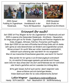 Die Termine für die nächste Zeit und die Gruppen werden rechtzeitig mitgeteilt. Besonders wichtig ist jetzt dieser Aufruf zur Erinnerung an alle, die bisher auch vor vielen Jahren bei Aktivitäten mit Frau Wagner dabei waren.