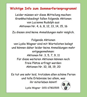 In den ersten beiden Wochen geht es los mit Betreuungswoche und Kinderfreizeit Coole Socke unterwegs. Ich freue mich auf viel Spaß und Erlebnissen mit euch Kids und Teenies dabei! Infos zu meinen Aktionen danach gibt es bei mir L. Wagner 0151 67802505.