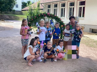 Mit diesem Lied begleiteten alle Eltern gemeinsam mit Pfarrer Zehnder jedes Kind durch den schönen Rosenbogen symbolisch aus der Kita in die Schule.
